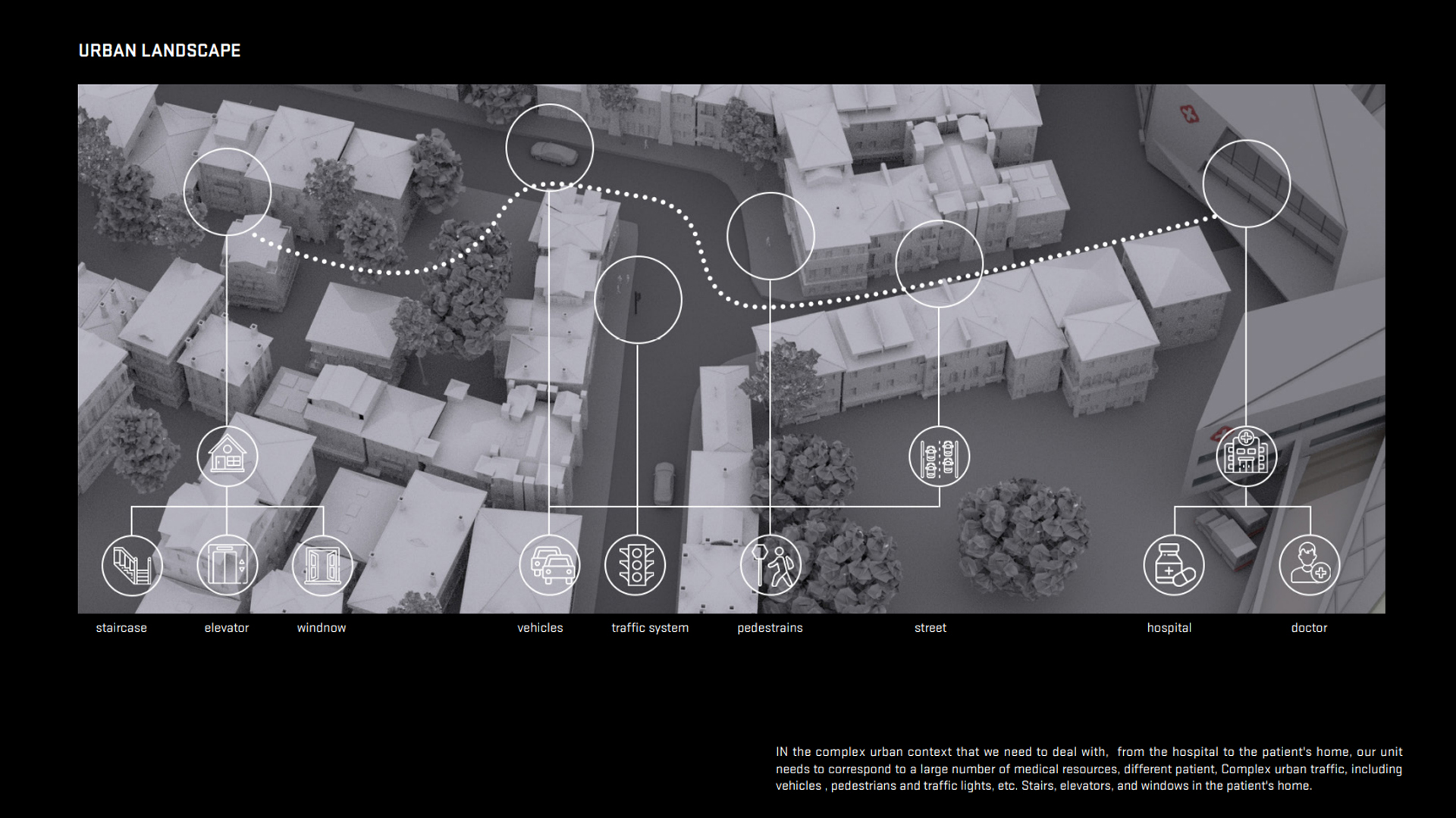 在紧急情况中,例如夜晚如果发生车祸后,巡逻的单元体发现了这种情况并将其信息发送给系统。系统通过评估其周围的单元体当前任务紧急等级来计算周围的单元体有哪些适合派遣到事发地点,随即立即激活无任务或紧急程度较低任务(比如常规检查及维护任务)的单元体。此外,系统会决定前往该事发地点的单元体的数量,系统将同时与现有的医疗系统(比如救护车)协同工作。单元体的目的地通过基于互相通信的决策流程而不断改变,以实现医疗资源的合理利用和突发事件的应对。